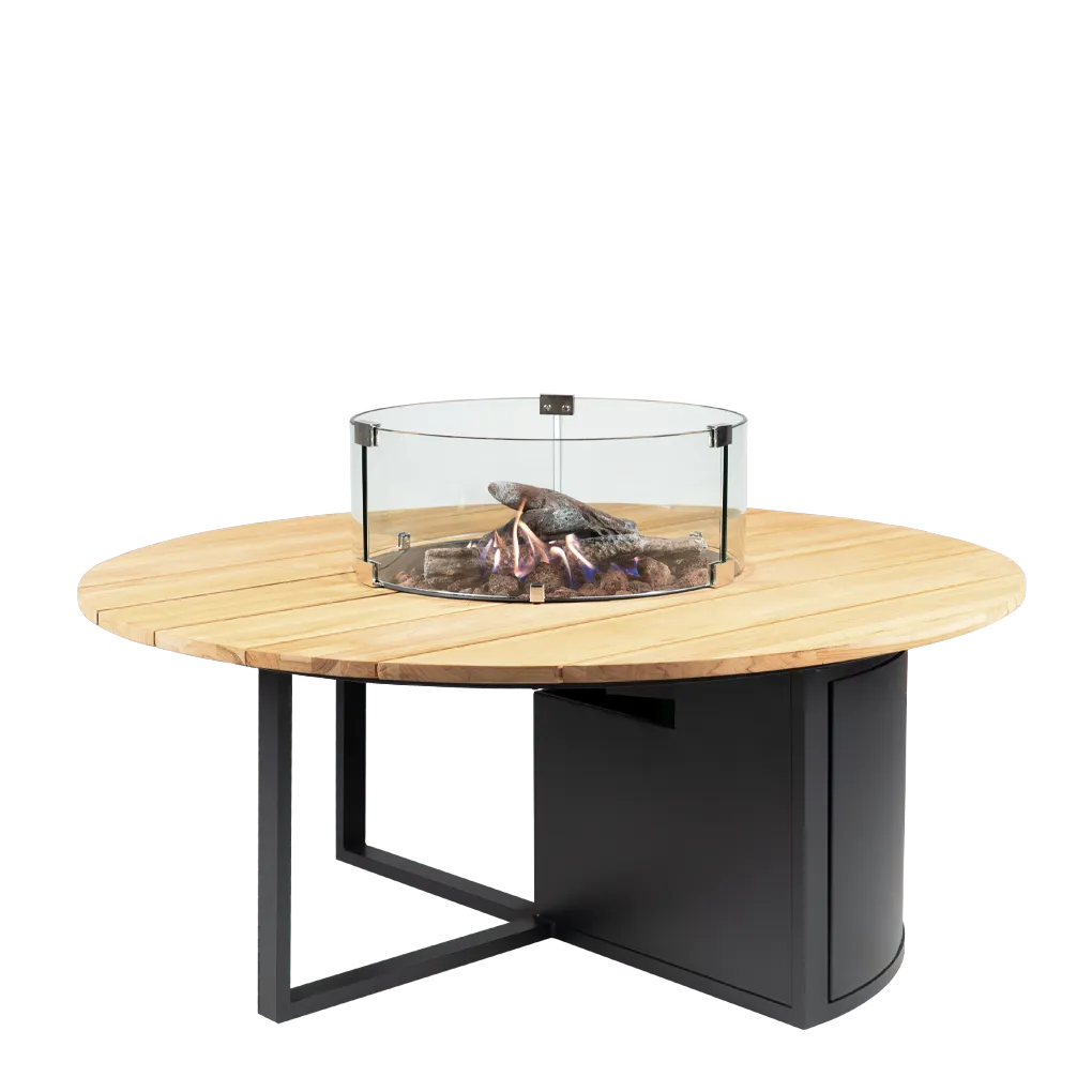 De Cosiloft 120 Round heeft een elegant, opengewerkt aluminium frame en een teakhouten tafelblad. Het frame is verkrijgbaar in twee kleuren: wit voor een moderne uitstraling of zwart voor een stoere, industriële look. Ondanks de comfortabele loungetafelhoogte biedt de Cosiloft 120 Round voldoende ruimte voor een 5 kg gasfles, die netjes is geïntegreerd in het strakke design van de tafel.